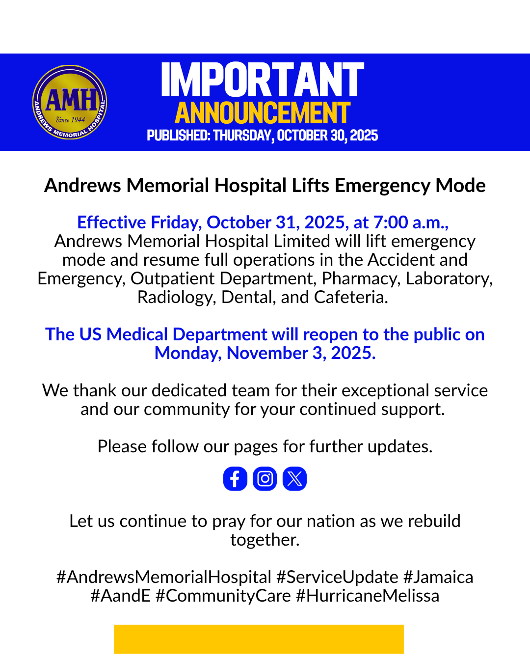 Effective October 14, 2025, all U.S. Medical prices are subject to change. Updated pricing will be posted on this website in the next few days. For time-sensitive inquiries, please call our U.S. Medical (876-618-1810) or email “US Medical” usmeds@amhosp.org or info@amhosp.org.